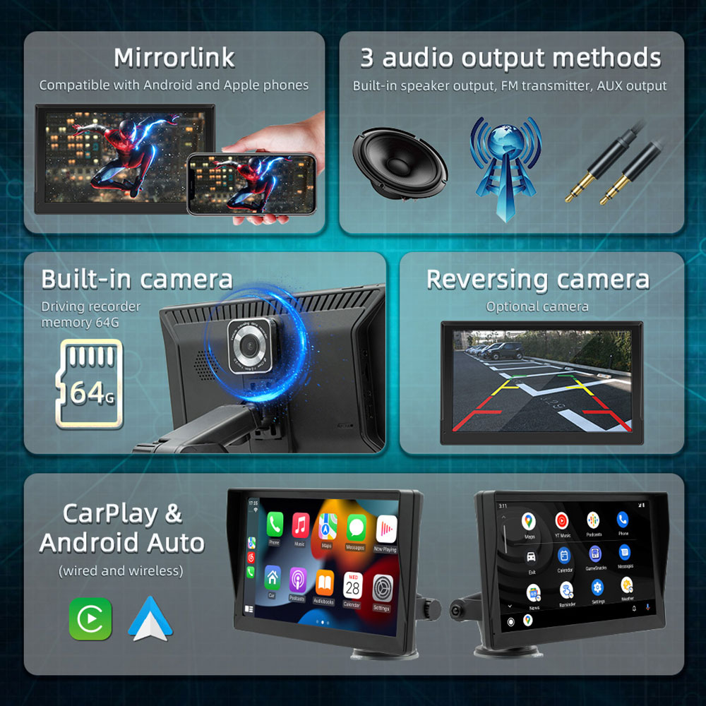 Преносимият CarPlay / Android Auto дисплей е  устройство, което ви позволява да интегрирате функциите на вашия смартфон във вашия автомобил. С вградена поддръжка както за Apple CarPlay, така и за Android Auto, този дисплей осигурява безпроблемно свързване и контрол на приложенията от смартфона ви директно на таблото на автомобила. Той е отличен избор за тези, които искат да модернизират своите автомобили без да правят скъпи модификации. Неговият удобен дизайн и широка съвместимост го правят идеален за ежедневна употреба, осигурявайки по-приятно и безопасно шофиране.