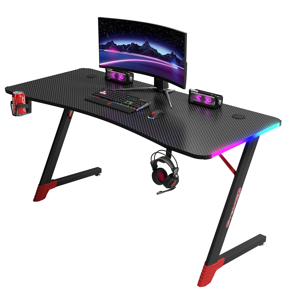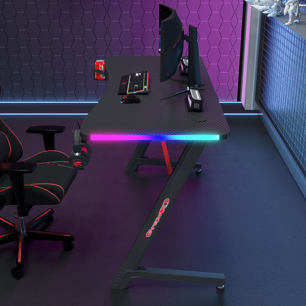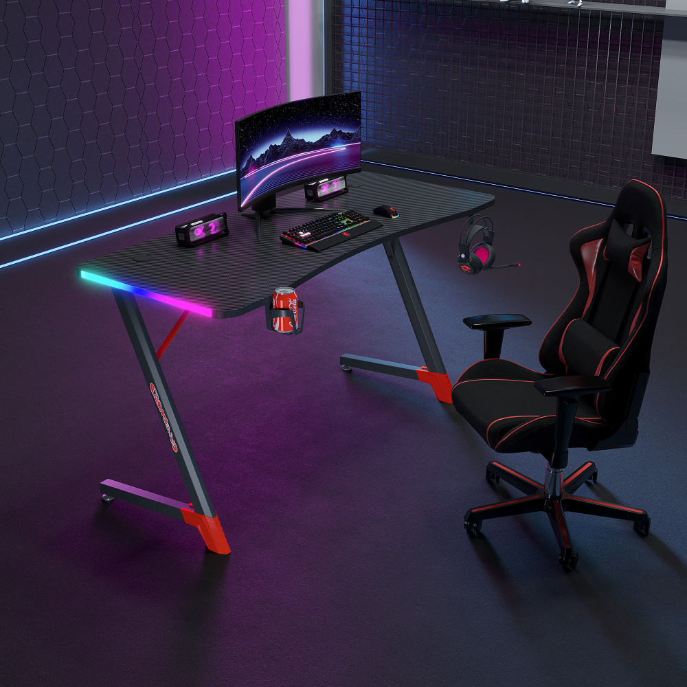 Геймърско бюро 4 в 1 включва поставка за чаша, кука за слушалки и RGB осветление.